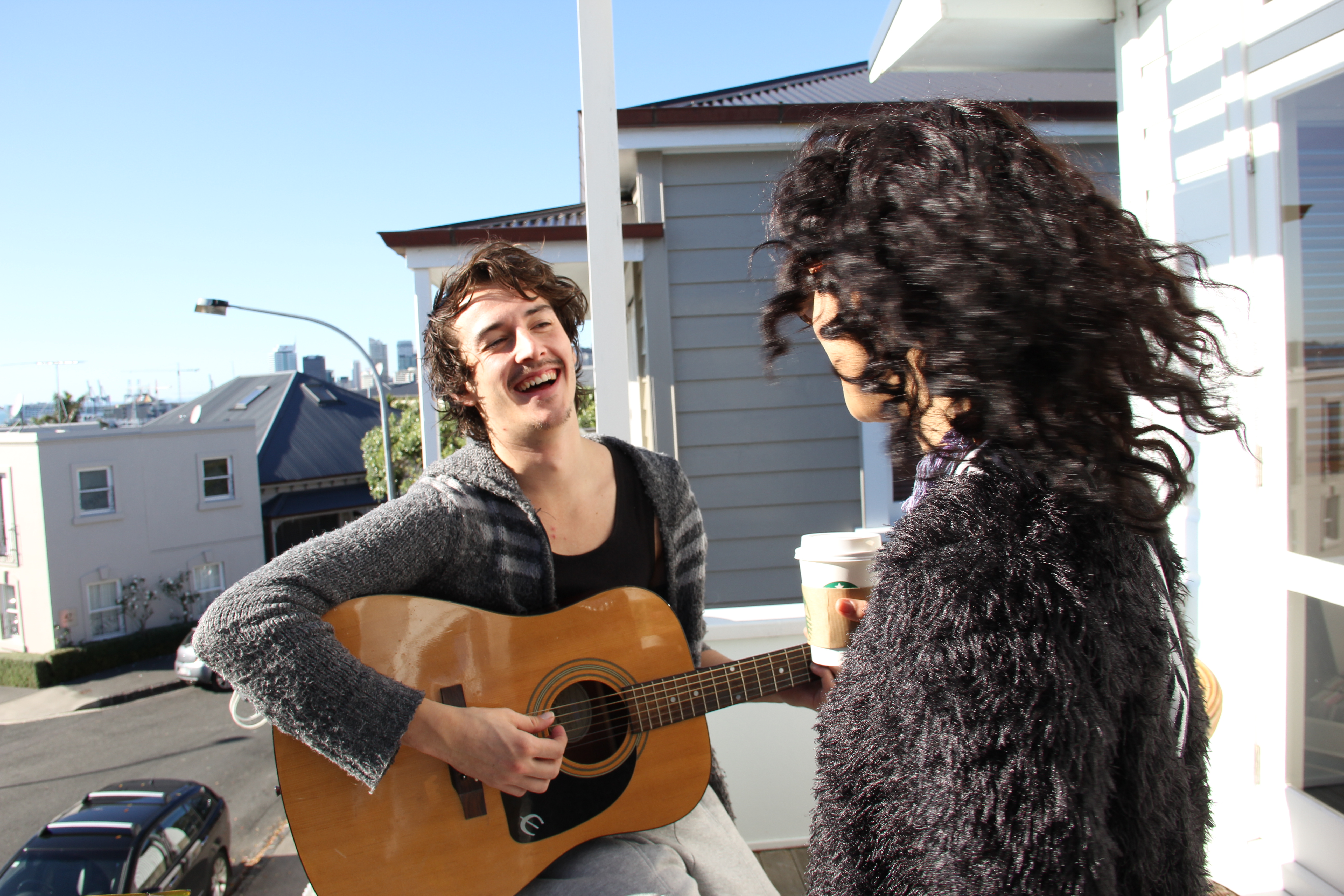 Mardana is also excited about other members of the mostly Kiwi cast, which include supporting actress from New Zealand, Amanda Titto, and lead actor, Graham Candy. Graham stumbled into the acting roll when he accidently met Shiloh while performing live music in a cafe bar in Auckland. Graham and Shiloh are acting out a scene together in the following photo.
