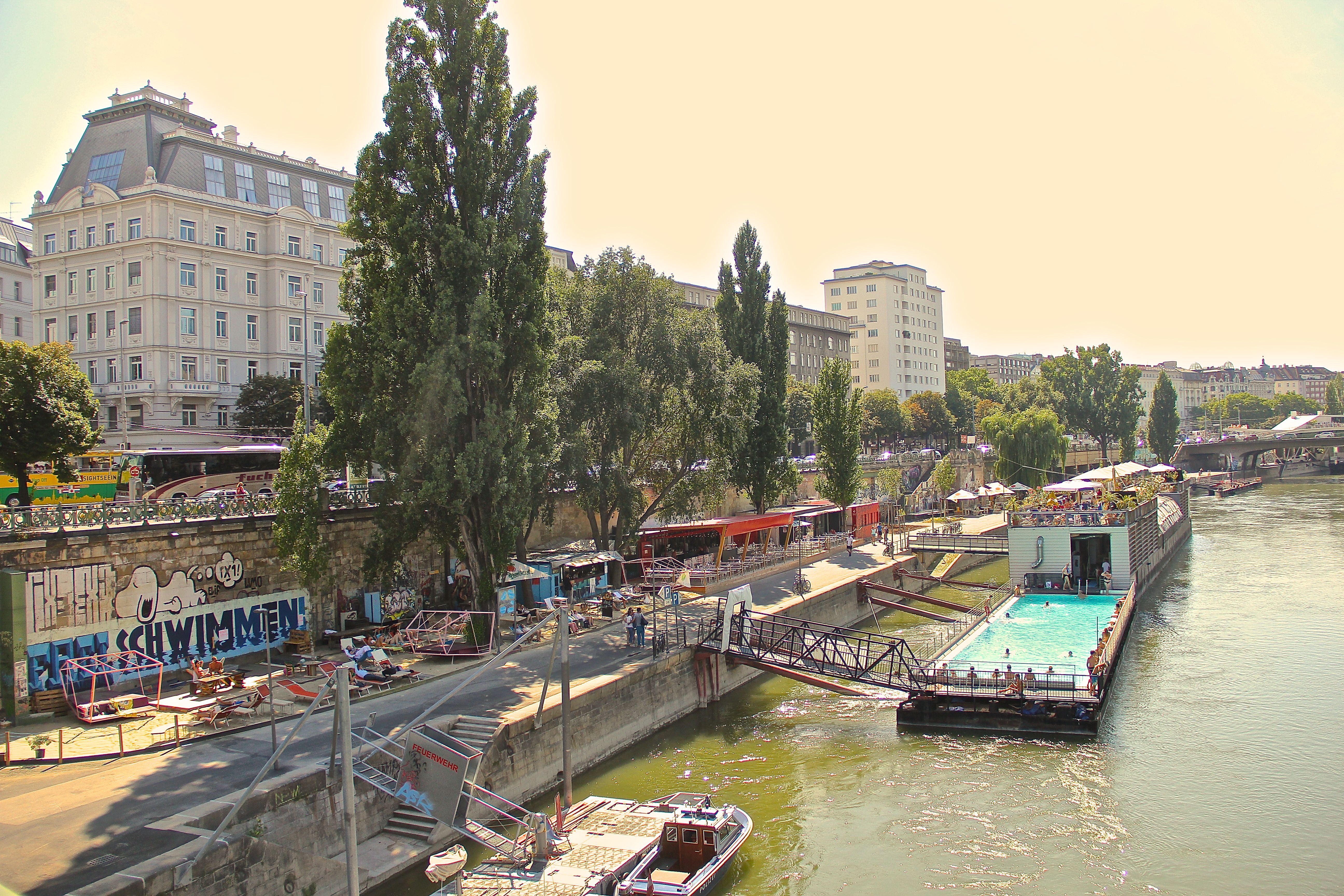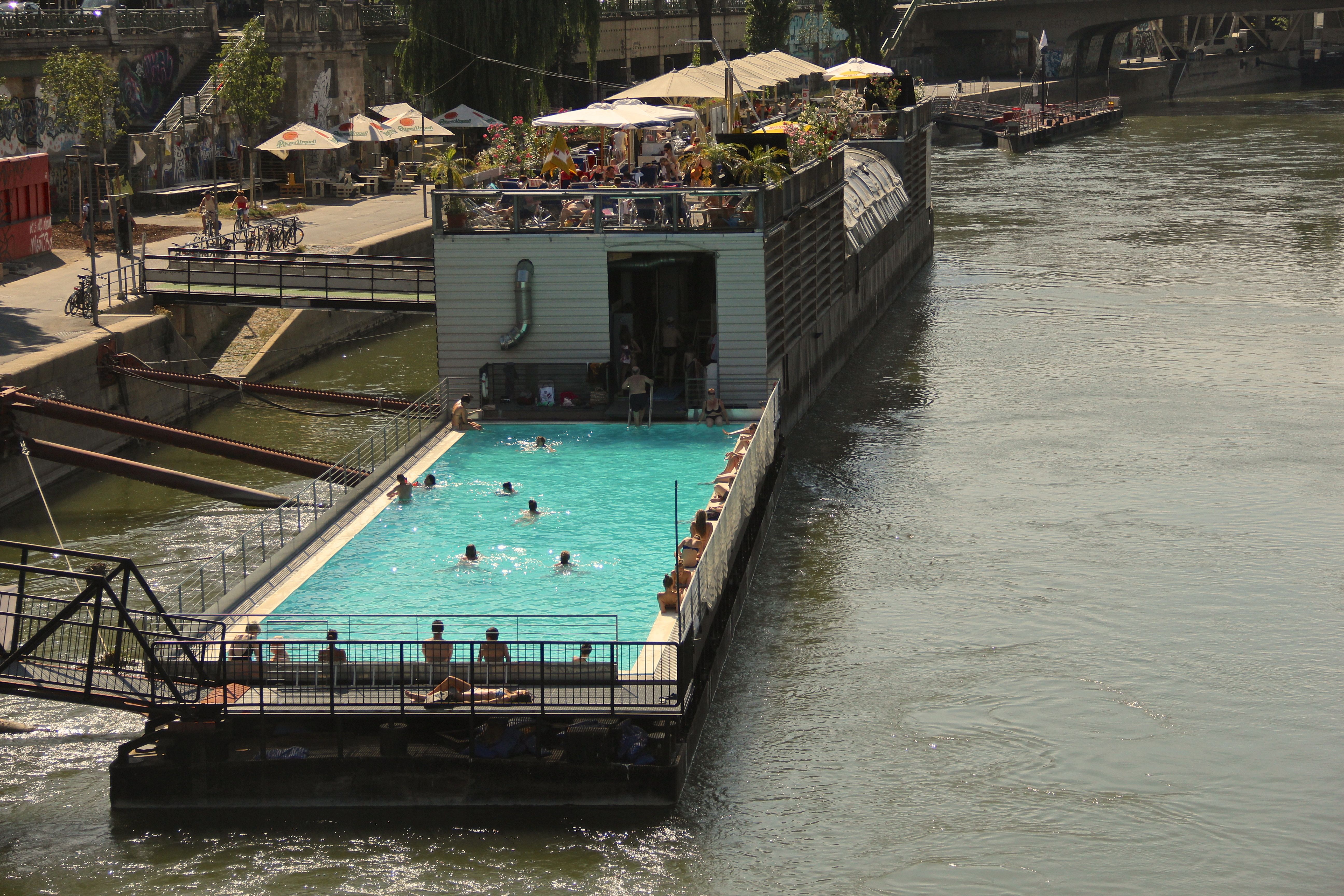 This floating pool is about 30 meters long and is open until 10 pm. This is the best way to go swimming in the heart of Vienna, and it is so cool to be swimming on a floating boat in the Danube Canal. There is a nice restaurant and bar connected to the pool on a second level, providing a good view and a cooler breeze.