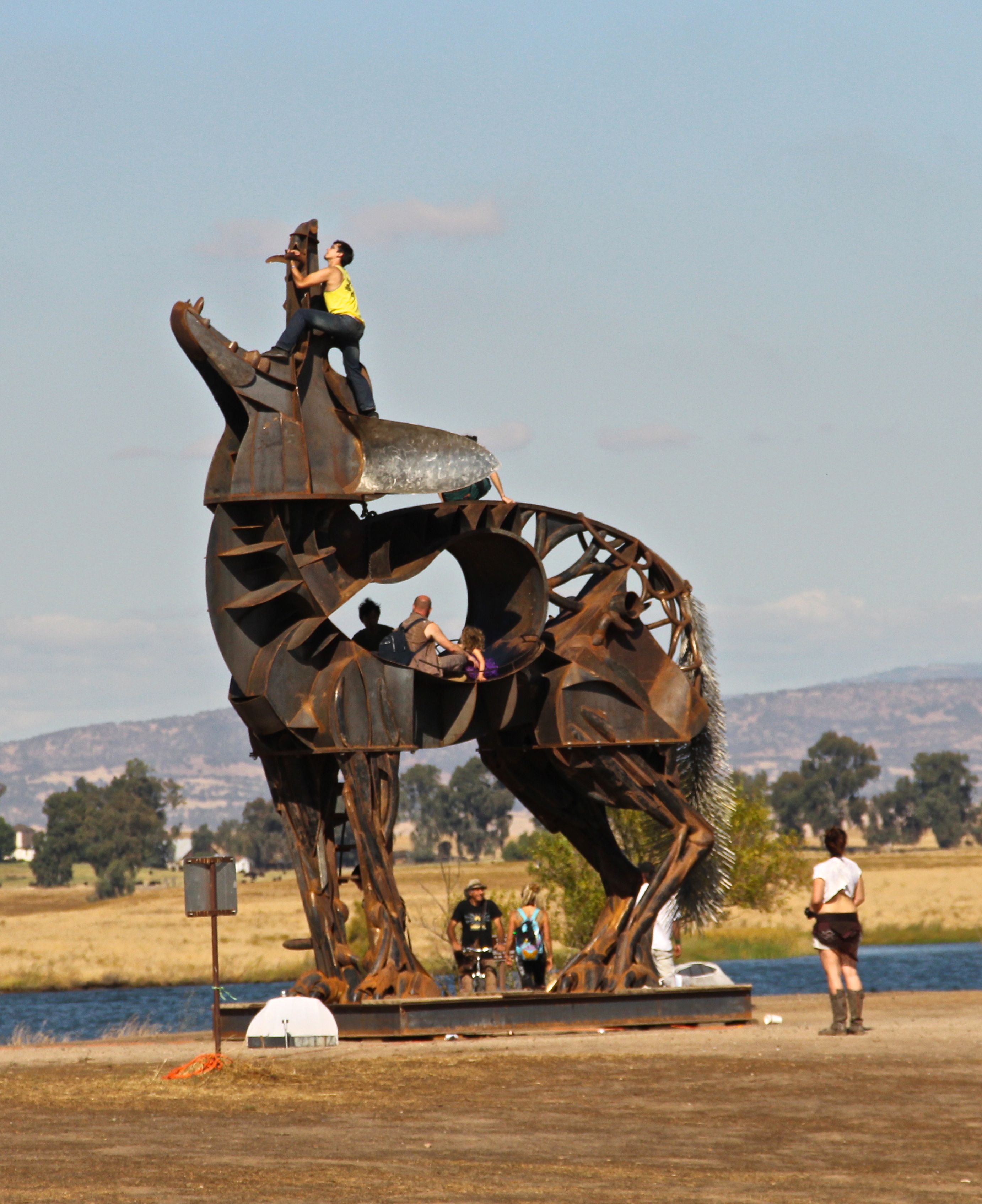 I would begin my long swims just beyond where my tent was pitched along the waterfront. I swam around the festival entrance where security checks wristbands, feeling like a water-ninja, although I was swimming with an expensive wrist-band. It was a very lovely, long swim; I just put my head down, flopping my arms in the cool water until I reached the first venue area, The Cove, with the wolf statue nearby that was brought from Burning Man. I got out, danced in the crowd, and warmed my body in the warm sun to sweet grooves.
