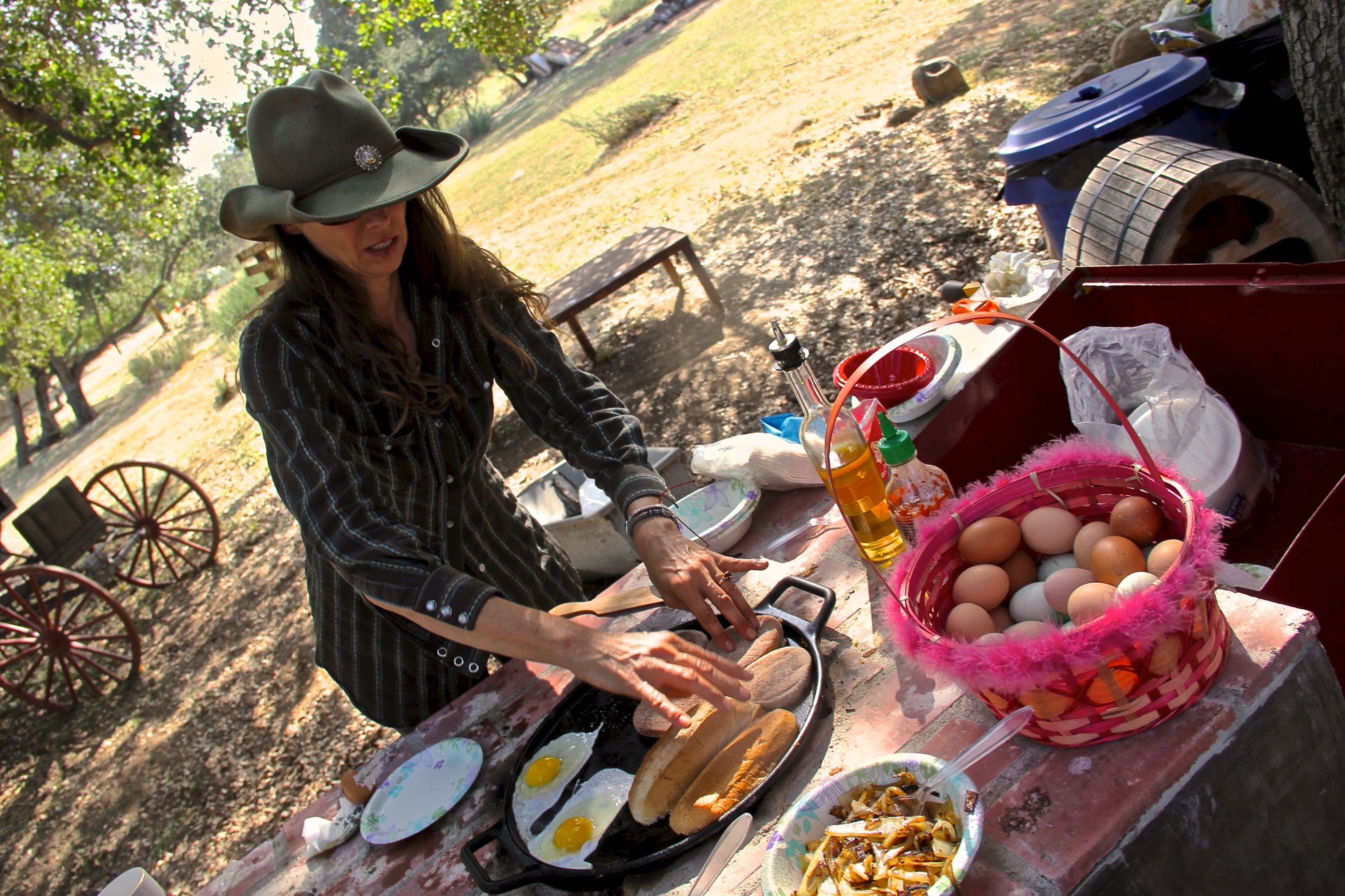 I reveal myself from my cozy blanket that protects me from the world, only to see the sun up in the sky and Emmanuelle hard at work cooking eggs for the early morning cowgirls and cowboys.
