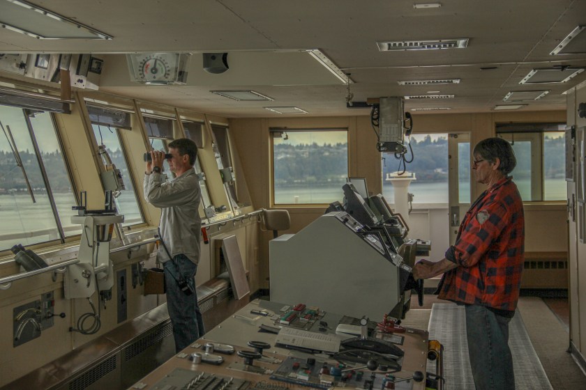 Captain Nick Christian looking out from the bridge of the container ship M.V. Horizon Kodiak in Puget Sound, arriving Port of Seattle.