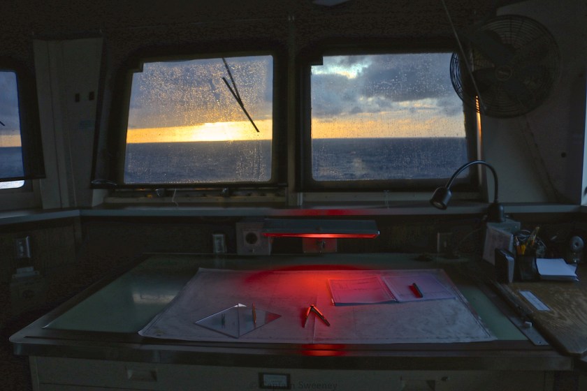 Chart table at sunrise on the bridge of a container ship on the 0400 to 0800 bridge watch. M.V. Matson Manoa.