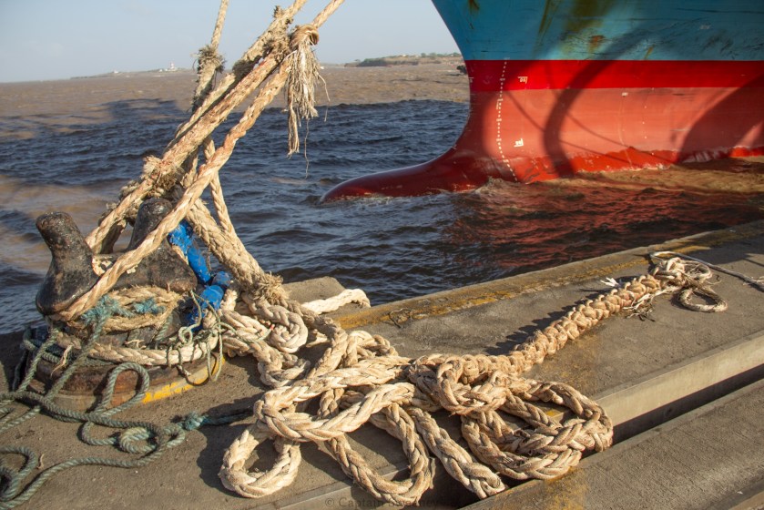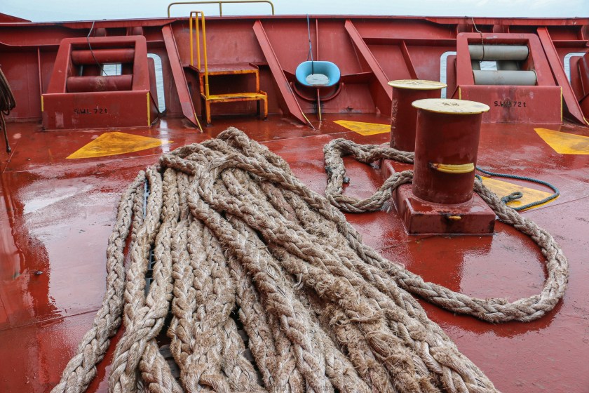 Preparing the mooring lines on the bow upon arrival for docking. M.V. Maersk Kensington.