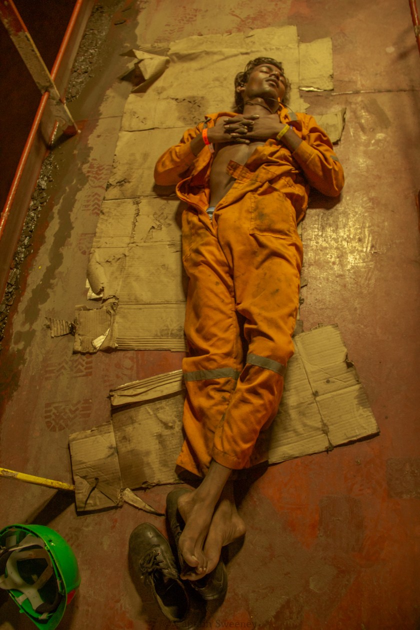 Indian Longshoreman sleeping on deck during cargo operations in Mumbai, India. M.V. Maersk Denver.