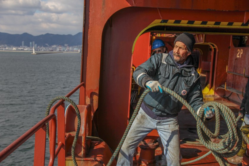 Able Seaman throwing a line to make the tug fast upon approaching the port entrance of Kobe, Japan. M.V. Sea Land Comet.