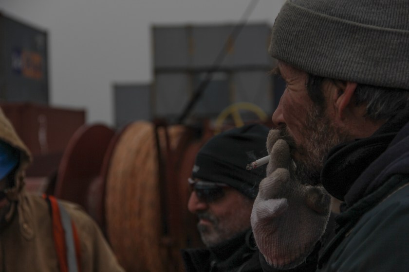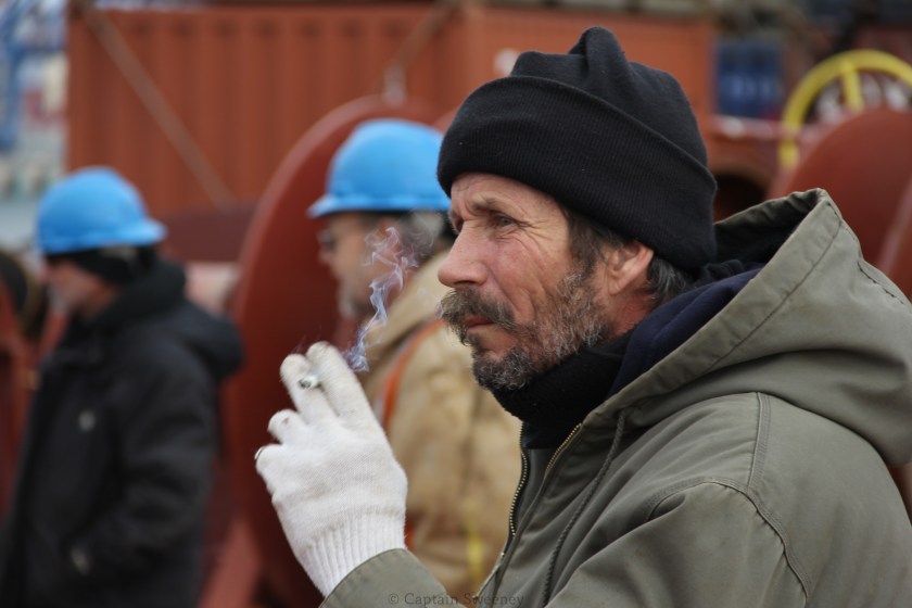 Smoking on the bow upon arriving into port. M.V. Sea Land Comet.