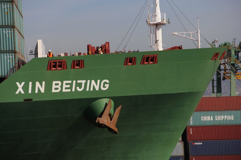 Man on the bow of a “Post Panamax” size container vessel (Length 1,105 feet) x (Width 150 feet). M.V. Xin Beijing docked in Oakland, California.
