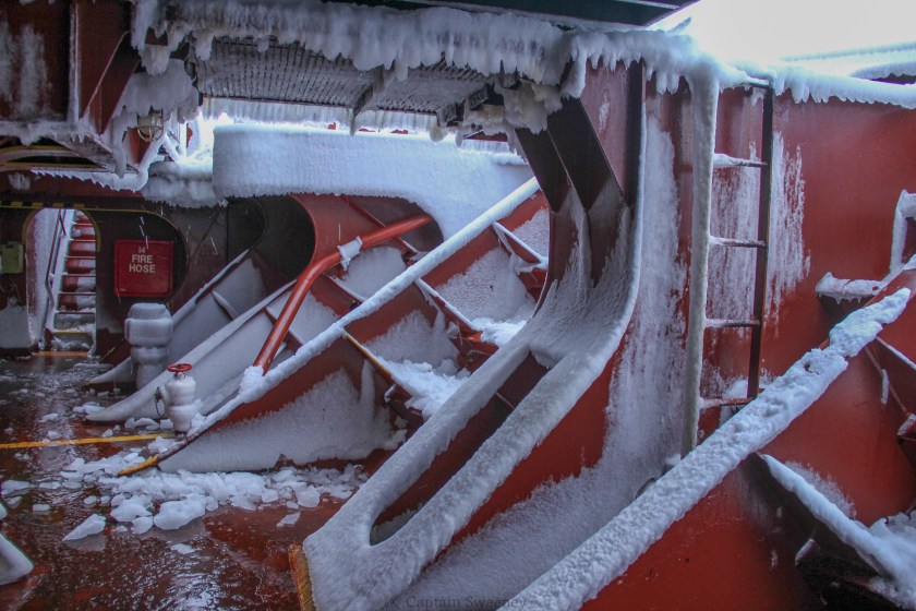 Frozen saltwater on the bulwark frames and stiffeners on the starboard side, forward deck entrance to the bow after a long night in rough seas in the Bering Sea. M.V. Sea Land Comet