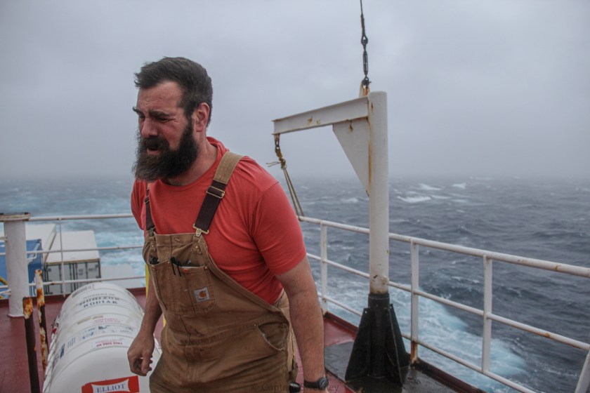 Bosun securing equipment on deck in rough seas. M.V. Horizon Kodiak, Pacific Ocean.