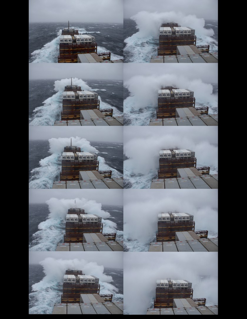 Waves over the bow in the Bering Sea. Underway from Dutch Harbor, Alaska to Yokohama, Japan. M.V. Sea Land Comet.