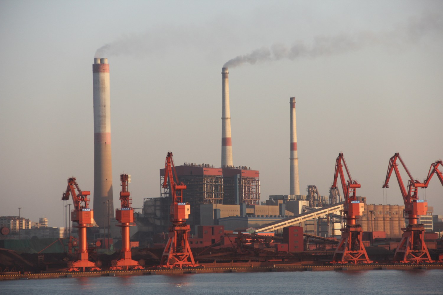 Smokestacks of a coal-fired power plant and bulk cargo cranes. Qingdao, China